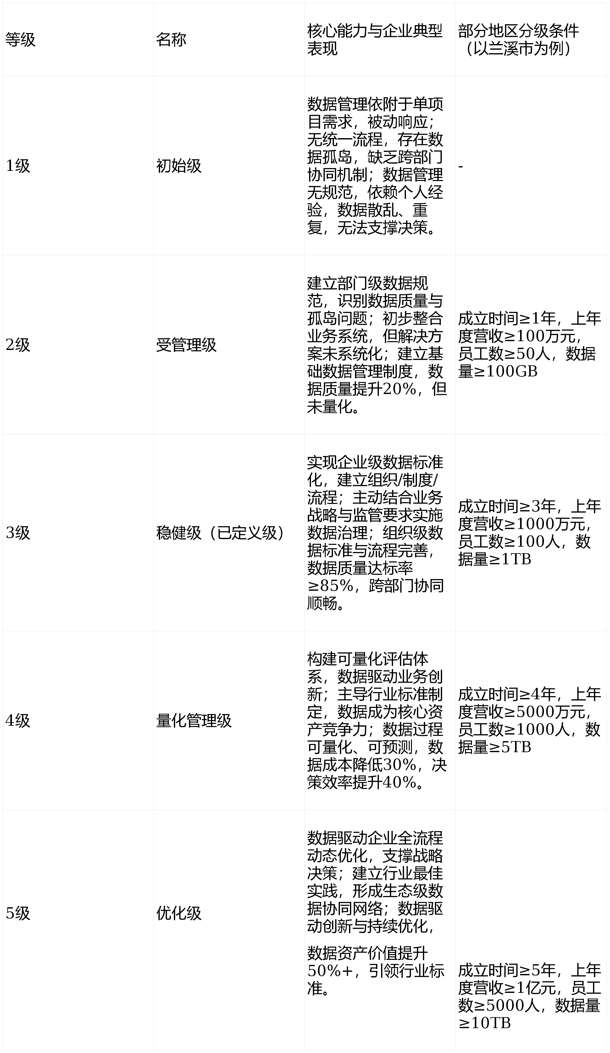 DCMM模型将组织的数据能力成熟度划分为5个从低到高的发展等级,不同等级代表组织数据管理和应用的成熟度水平差异,具体特征及部分地区分级要求如下: