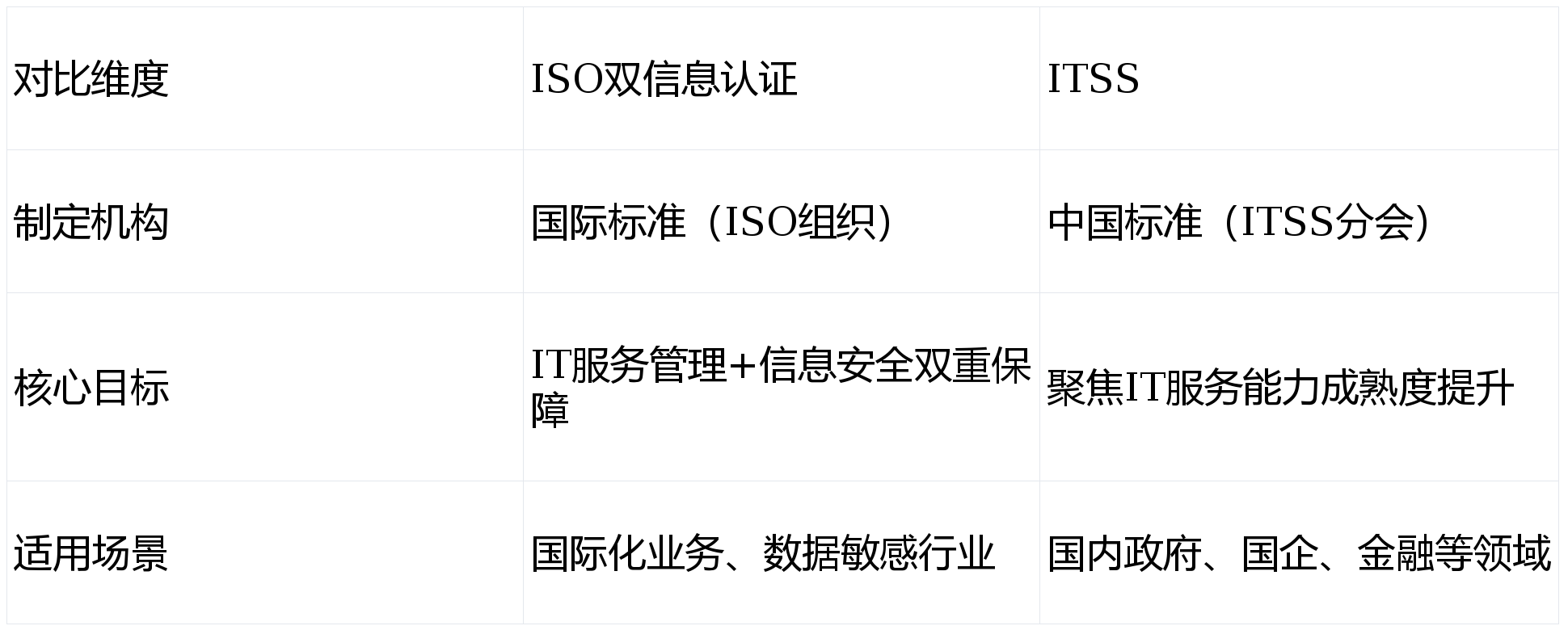 双信息认证(ISO20000+ISO27001)与国内ITSS(信息技术服务标准)定位不同,核心差异如下: